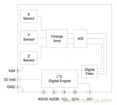 圖2:Kionix公司KXCJ9硅加速度計容納于在從第二貼合晶片在晶片級別創(chuàng)建一個密閉的腔。一個單獨的信號處理ASIC上安裝有傳感元件,以進一步降低傳感器的整體尺寸,產(chǎn)生了3&TImes;3&TImes;0.9毫米的LGA塑料封裝從1.8操作 - 3.6伏直流電源。穩(wěn)壓器用于保持對輸入電源電壓范圍內(nèi)恒定的內(nèi)部工作電壓。這樣,可以通過輸入電源電壓的范圍內(nèi)穩(wěn)定的工作特性,以從供給變異去除任何錯誤,并消除了對外部電源調節(jié),進一步降低了設計的整體尺寸。