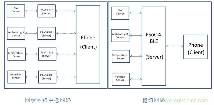無線傳感器網(wǎng)絡(luò)通常作為網(wǎng)狀網(wǎng)絡(luò)和樞紐網(wǎng)絡(luò)(見圖1)。樞紐網(wǎng)絡(luò)包括可以放置在相同位置的所有傳感器。每個傳感器需要連接到單個BLE外圍設(shè)備(服務(wù)器)來處理數(shù)據(jù)并將其發(fā)送到BLE中央設(shè)備(客戶端)。網(wǎng)狀網(wǎng)絡(luò)采用可以遠(yuǎn)程定位傳感器的拓?fù)浣Y(jié)構(gòu)。網(wǎng)格中的每個節(jié)點都需要連接到BLE外圍設(shè)備(服務(wù)器),所有這些外圍設(shè)備都可以連接到BLE中央設(shè)備(客戶端)。