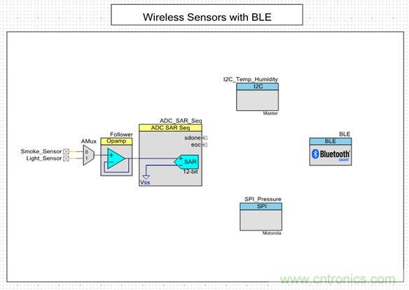內(nèi)置BLE功能的處理器的靈活性和豐富資源,使傳感器能夠與單一BLE設(shè)備連接。圖2是使用PSoC Creator的典型配置。PSoC Creator是一個用于圍繞PSoC架構(gòu)開發(fā)應(yīng)用程序的IDE。圖中顯示的是模擬和數(shù)字傳感器接口以及BLE子系統(tǒng)。該配置展示的是用于感測煙霧、光照強(qiáng)度、溫度、濕度和壓力的典型工業(yè)數(shù)據(jù)監(jiān)測系統(tǒng)。配置中的每個組件都有一個關(guān)聯(lián)的應(yīng)用程序編程接口(API),開發(fā)人員可根據(jù)需要訪問這些組件。每個組件還有一個與其相關(guān)的數(shù)據(jù)表對組件的可用配置進(jìn)行說明。