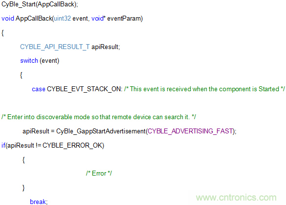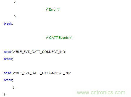 BLE中的一切都作為“活動”處理。BLE堆棧提供處理這些事件的“定義”。以下代碼片段展示了其中一部分活動的運(yùn)行。
