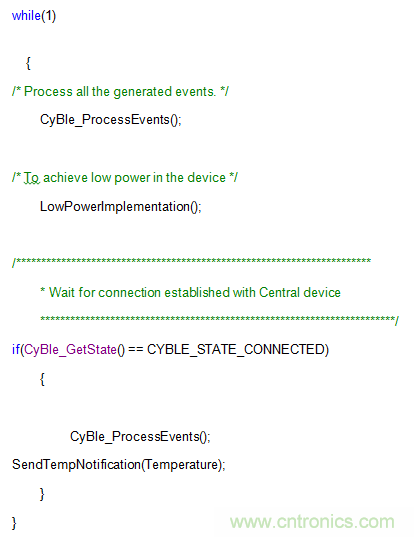 一旦兩個設(shè)備實現(xiàn)連接,就能使用連接間隔不同的通知發(fā)送數(shù)據(jù)。應(yīng)用程序接口“CyBle_ProcessEvents()”應(yīng)置于while(1)循環(huán)中,且必須在每個連接間隔中至少調(diào)用一次。我們也可以調(diào)用在同一while循環(huán)中將數(shù)據(jù)作為通知發(fā)送的函數(shù)。以下函數(shù)可用于將溫度數(shù)據(jù)的一個字節(jié)作為通知發(fā)送。這也適用于其他傳感器特性。