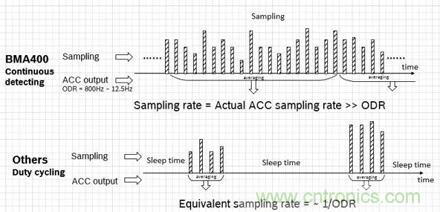 可是,如我們前述“加速度傳感器在物聯(lián)網(wǎng)應用中扮演重要角色”,傳感性能決定了系統(tǒng)能否基于傳感器做出精準的識別和決策。為了提高對原始信號的有效采集,并降低噪聲及高頻信號的干擾(混疊Aliasing),BMA400在正常工作模式下,采用了連續(xù)采樣和滑動低通濾波的方式。