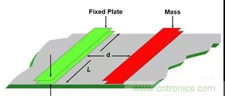 通用 MEMS 感應技術(shù)是使用片載可變電容器。在運動中,綠色的固定板保持靜止,而橙色的重物沿加速度軸彎曲。通過這種運動,電容值 C1 和 C2 會隨著固定板與重物之間距離的變化而變化。