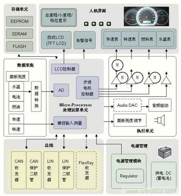 在汽車儀表系統(tǒng)中,各種儀表的傳感器的作用是將發(fā)動機溫度、機油壓力、發(fā)動機轉(zhuǎn)速、變速器輸出軸轉(zhuǎn)速、燃油箱油面的高低等物理參量轉(zhuǎn)換為相應的電壓、電流或電脈沖。并驅(qū)動相應的儀表動作,顯示相應的被測量參量。當測量值達到預設的極限值時就會使指示燈報警。