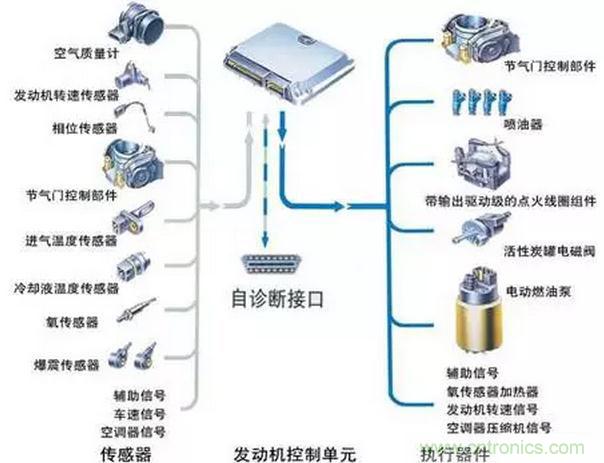 汽車電子控制系統(tǒng)有傳感器、電子控制器(ECU)和執(zhí)行器的組成。在汽車電子控制系統(tǒng)中,傳感器的作用是將被控對象的相關(guān)參量轉(zhuǎn)換為相應的電信號,并輸送給控制器,控制器根據(jù)相關(guān)傳感器的信號對被控對象的工況及狀態(tài)進行分析與判斷后,輸出控制信號,通過執(zhí)行器實現(xiàn)自動控制。電子控制系統(tǒng)分為發(fā)動機電子控制系統(tǒng)、底盤電子控制系統(tǒng)和車身電子控制系統(tǒng)。