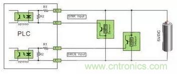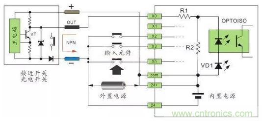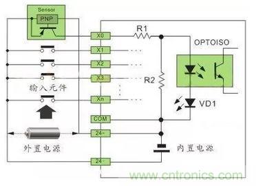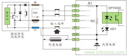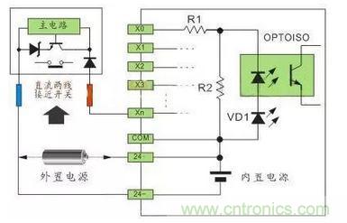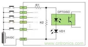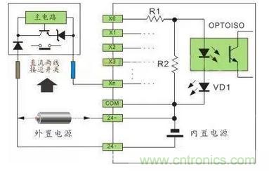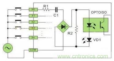 直流電可以由PLC內部提供也可以外接直流電源提供給外部輸入信號的元件。R2在電路中的作用是旁路光電耦合器內部LED的電流,保證光電耦合器LED不被兩線制接近開關的靜態泄漏電流導通。
