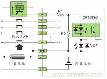 注:24VDC供電的傳感器,在輸入回路上需要串聯限流電阻,R1為10Ω,R2為2KΩ,不串聯限流電阻,將燒毀接口回路,限流電阻取值2.7KΩ。