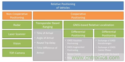 用于車輛相對定位的測距傳感器和技術可以概括為下圖,首先分為兩大類:非協作式定位和協作式定位。非協作式定位包括:雷達、激光掃描儀、視覺和TOF攝像機;協作式定位包括:基于轉發器的測距(根據射頻信號直接估算相對距離)和基于GNSS的相對定位(通過通訊的方式傳遞GNSS測得的位置相關信息,包括GNSS解算得到的位置和原始的GNSS信息,如偽距)。具體對各個定位技術的介紹請參見原文,限于篇幅,本譯文只進行部分翻譯,著重于定位需求的分析以及對各個定位技術的評價。