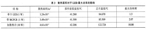 表3為3種不同散熱方式對LED的溫度分布、最大功率的影響。可以看出,增加散熱面積是很好的散熱方式,可以輕易地提高LED器件散熱能力,這是目前LED產品所普遍使用的散熱方式之一。然而缺點也很明顯:影響成本、增加產品重量、影響封裝密度。無限度地提高LED散熱片面積顯然不現實,因此一般使用1.5inch2散熱片提升LED產品最大功率至10W左右,出于成本等因素就不能繼續提高。