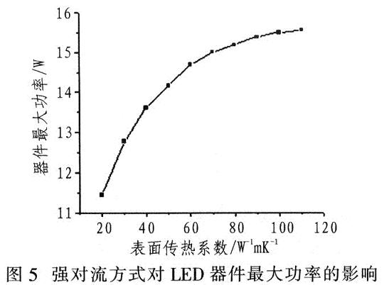 常見對流散熱方式有兩種:自然對流和強制對流。固定結構的散熱與表面傳熱系數有關。空冷方式時,不同傳熱系數對最大功率的影響如圖5所示。強對流方式在一定速度內會大大提高LED產品的散熱能力,有助于提高散熱效果。